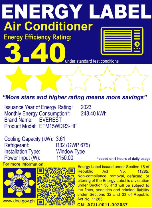 EVEREST 1.5HP Non Inverter Window Type Manual Aircon/ Fast Cooling/ Healthy Air Filter/18-24 sqm/ ETM15WDR3-HF