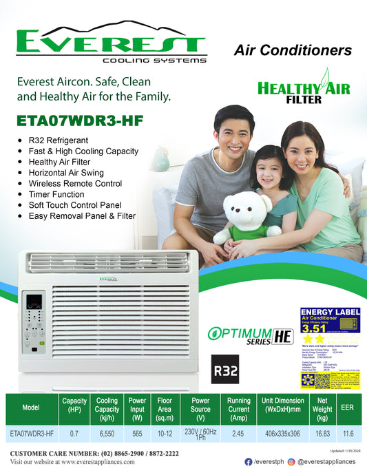 EVEREST 0.7 HP Window Type Aircon|R32 Refrigerant| Horizontal Air Swing Wireless Remote Control|Timer Function |Application Area: 10-12sqm|Dimension(WxDxH) 40.6x33.5x30.6cm|16.83kg|ETA07WDR3-HF