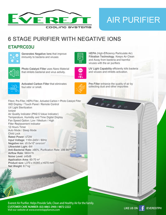 EVEREST 6 Stage Air Purifier |Filters: Pre-Filter, HEPA Filter,|Activated Carbon + Photo Catalyst Filter|IMD Display / Touch Panel / Remote Control|UV Light Sterilization|Ionizer| Product size: L370 x W265 x H570 mm|Net Weight: 8.7 kg|ETAPRC03U