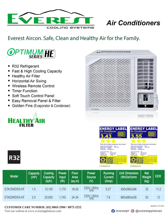 EVEREST 1.0 HP Window Type Aircon|non-inverter|automatic with remote|r32 refrigerant|healthy air filter|horizontal air swing| timer function|easy removal panel filter|application area: 12-18 sqm.|kg.25.5|Dimension (WxDxH)45x58.5x34.6cm| ETA10WDR3-HF