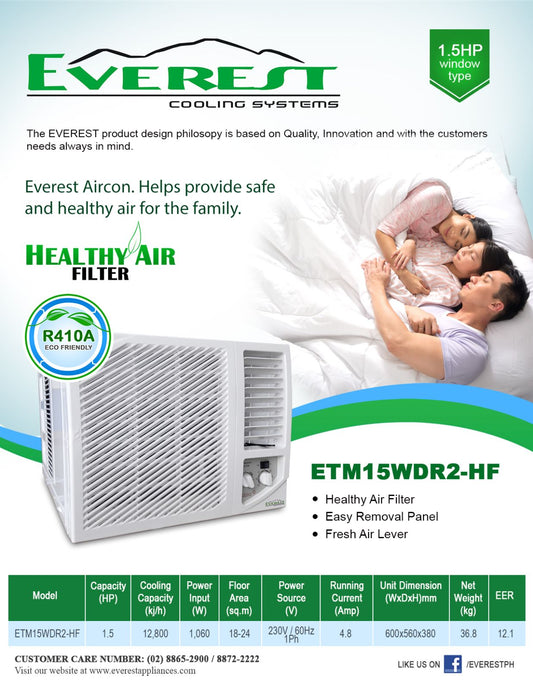 1.5 HP Window Type Aircon|non-inverter|manual control|r410a refrigerant|healthy air filter| horizontal air swing|soft touch control panel|application area: 18-24 sqm.|Dimension (WxDxH)60x56x38cm| 36.8kg| ETM15WDR2-HF