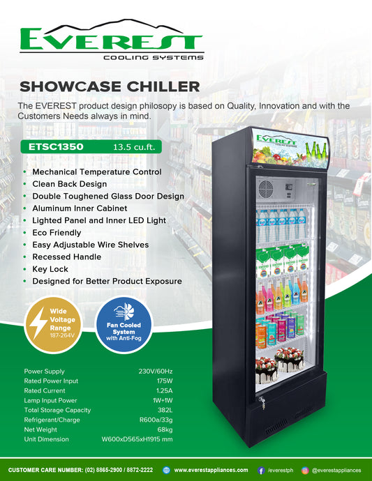 EVEREST 13.5 cu.ft. Showcase Chiller, Defrost|mechanical temperature control| clean back design|aluminum inner cabinet|lighted panel and inner LED light|eco friendly|easy adjustable wire shelves|recessed handle|key lock|6.3ft.|68kg.|ETSC1350