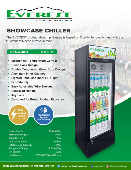 EVEREST 8.8 cu.ft. Showcase Chiller, Defrost|mechanical temperature control| clean back design|aluminum inner cabinet|lighted panel and inner LED light|eco friendly|easy adjustable wire shelves|recessed handle|key lock|5.5ft.|53kg.|ETSC880