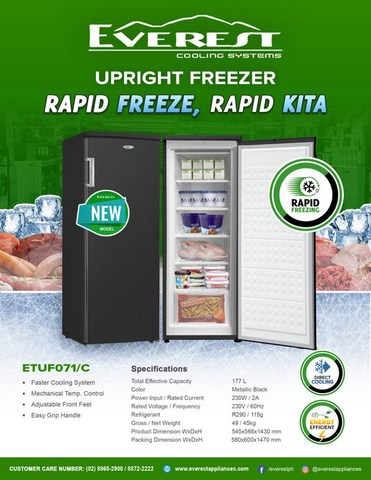 EVEREST 7.1 Upright Freezer Defrost|Faster Cooling System| Mechanical Temperature Control| Adjustable Front Feet| Easy Grip Handle|Dimensions: (DxWxH)54.5x56.6x143.0cm|4.7 ft|45kg||ETUF071/C