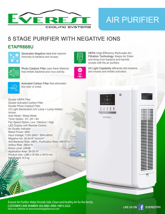 EVEREST 5 Stage Air Purifier |Double HEPA Filter|Double Activated Carbon Filter|Double Photo Catalyst Filter|UV Light Sterilization (UV Lamp + Lamp Holder)|Ionizer|ETAPR668U